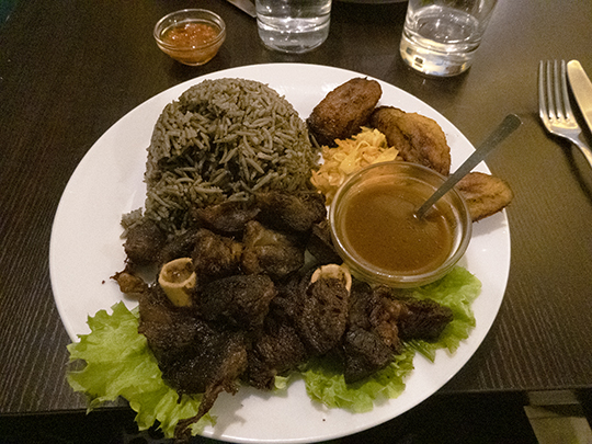 Each dish came with a choice of bananes pésées (savory plantains) or aloko (ripe plantains) and a choice of white rice, white rice cooked with red beans and coconut milk, or riz djon djon (a traditional Haïtian rice dish made with black mushrooms).
