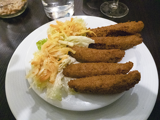 For our first course, Tom ordered Acras de malanga (fritters made with taro root) and I ordered samoussas aux légumes végétarien.