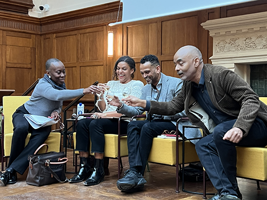 During the afternoon Scholars' Roundtable, the panelists and moderator kicked off the session with a glass of white wine in the spirit of gathering around Baldwin's Welcome Table.
