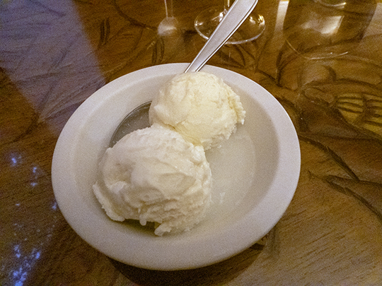 Tom ordered Koutou Glace, which is a serving of mango ice cream with koutoukou. He requested that the mango ice cream be replaced with coconut ice cream, and the waiter happily obliged him. Tom thoroughly enjoyed this dessert.