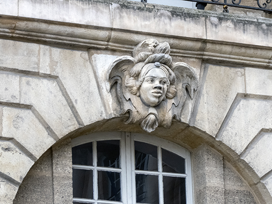Farther along the route, near the colossal Place de la Bourse (formerly Place Royale), Diallo pointed out mascarons on the façade of a building. He talked about how some of these have African features and talked about the creolization of the population because of forced miscegenation.