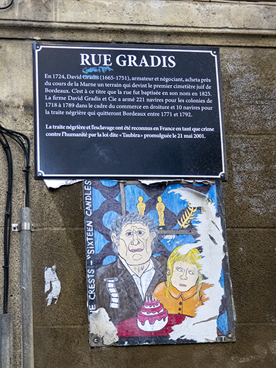 We saw one of these signs near Place de la Victoire. It informs passersby of the involvement of David Gradis (after whom the street is named) in slavery and the slave trade and categorically states that France has declared slavery and the slave trade crimes against humanity.