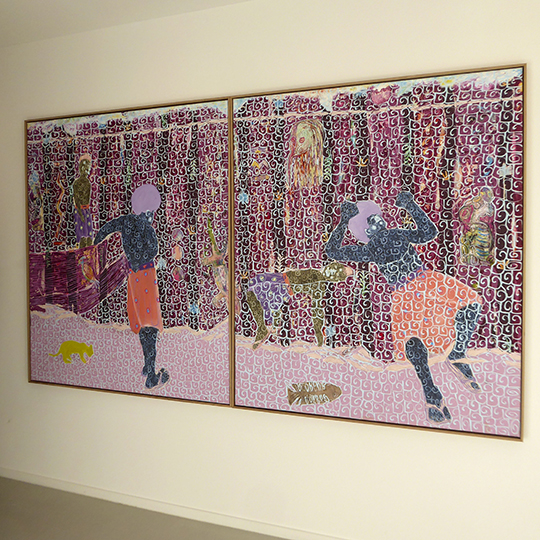 Eight paintings, three of which are diptychs, are displayed on the gallery's two floors.