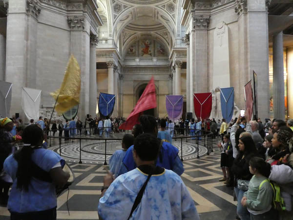 Mas Choukaj, a group of Caribbean carnival musicians based in Seine-Saint-Denis, delivered an inspirational performance of drumming and chanting while revealing the banners of the honored historical figures one by one. The massive monument to the National Convention, located in the eastern part of the nave, served as a backdrop.