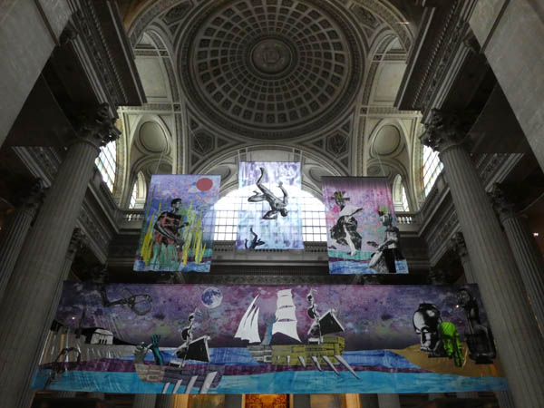 The artist, Raphaël Barontini, has created an "imaginary pantheon" of five women and six men who led or otherwise positively influenced the struggle for emancipation in Saint-Domingue (now Haïti), St. Lucia, Guadeloupe, Reunion Island, and French Guiana. Ten artworks depicting these heroic people flank the west nave of the Pantheon (nearest the entrance), with flags made from dyed and iridescent fabrics serving as backdrops. (One man and one woman - Anchaing and Héva of Reunion Island - are represented as a couple.)